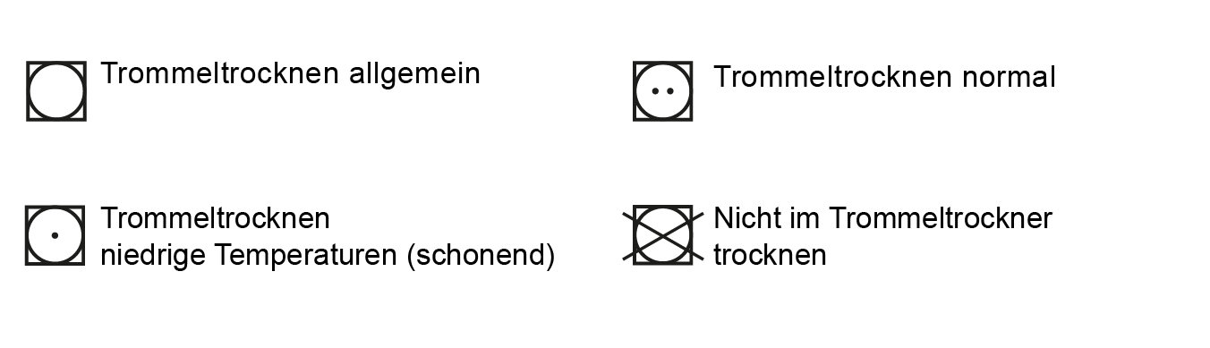 A circle in a square with one or two dots allows drying in the tumble dryer. One dot indicates drying at a reduced temperature, two indicate a normal temperature. Important: The crossed-out symbol means that the item cannot be machine dried.